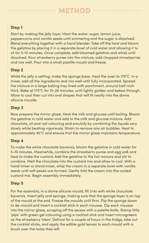 To celebrate their incredible achievement, we present you with a seasonally sweet strawberry dessert recipe from the contestants themselves. This strawberry and pink peppercorn mirror glaze mousse is loaded with summer flavour and perfect for Wimbledon season, but it’s certainly a challenge!